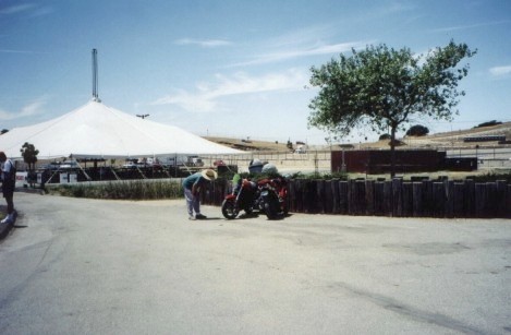 This guy is inspecting my Ben sign on my bike. We arrived at Laguna Seca on Thursday and the vendors and manufacturers were just beginning to set up shop. There were only a few bikes on Ducati Island. We enjoyed strolling around the track before the unwashed masses showed up.