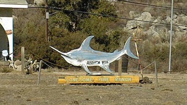 There are several classes of houses along Highway 94: quirky, crappy, or abandoned. Can you guess which one this is? If you said "crappy" you need to free your mind. What can be cooler than to have a big swordfish in the front of your house? I aspire to emulate, if not exceed. I might just carve myself a whale for the old homestead.