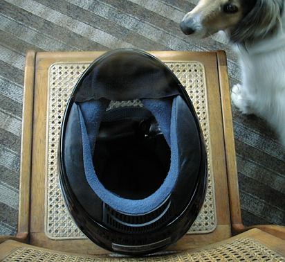 Layer 7: "Neck gasket" and helmet. The neck gasket can be made of any material; all it has to do is create an "air dam" at the top of your jacket so the air can't rush down your jacket. I sewed a loop of fabric together that was just big enough to pull over my head and long enough to wad up somewhat and create the air dam. I also sewed a flap of fabric beneath my chin. This reduces air movement inside the helmet dramatically. It's also good for people who wear contacts and would benefit from reducing air disturbance inside the helmet. All you have to do is sew two anchor points onto the padded area; then you can shove the rest of the fabric into the "crack" around the edge of the helmet. |