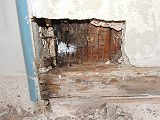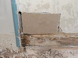 ![]() This corner shows the evidence of the shower leaking behind the wall. It was rotted, but not enough for a complete tear-down. |