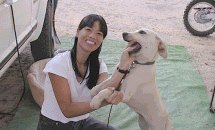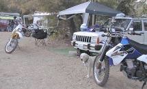 Terry was set up when we arrived. That's his bike in the foreground and his Jeep behind it. More importantly, there is Zina the dog with the classic snoozy-dog look on her face. Frandy's campground in Kernville is a big dirt lot located along the river. You could set up wherever you wanted. Unlike the Kelleys, Terry appeared to be an experienced camper as he was wise enough to bring a big piece of astroturf to mark off his "living room." |