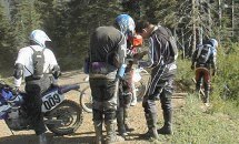 | After Dan led us to the expert trail, he took off since we were no longer officially lost. After making it through a stretch of trail that scared the living crap out of us, we decided that it was better to be lost than to go through any more of that. Some of these other guys had also lost the easy trail and wanted no more hard-man action. Chris and a couple of other guys were trying to figure out where we were. Notice the guy on the far right: he's looking at sign that has been knocked to the ground so we couldn't tell which marker had been pointing which way. |